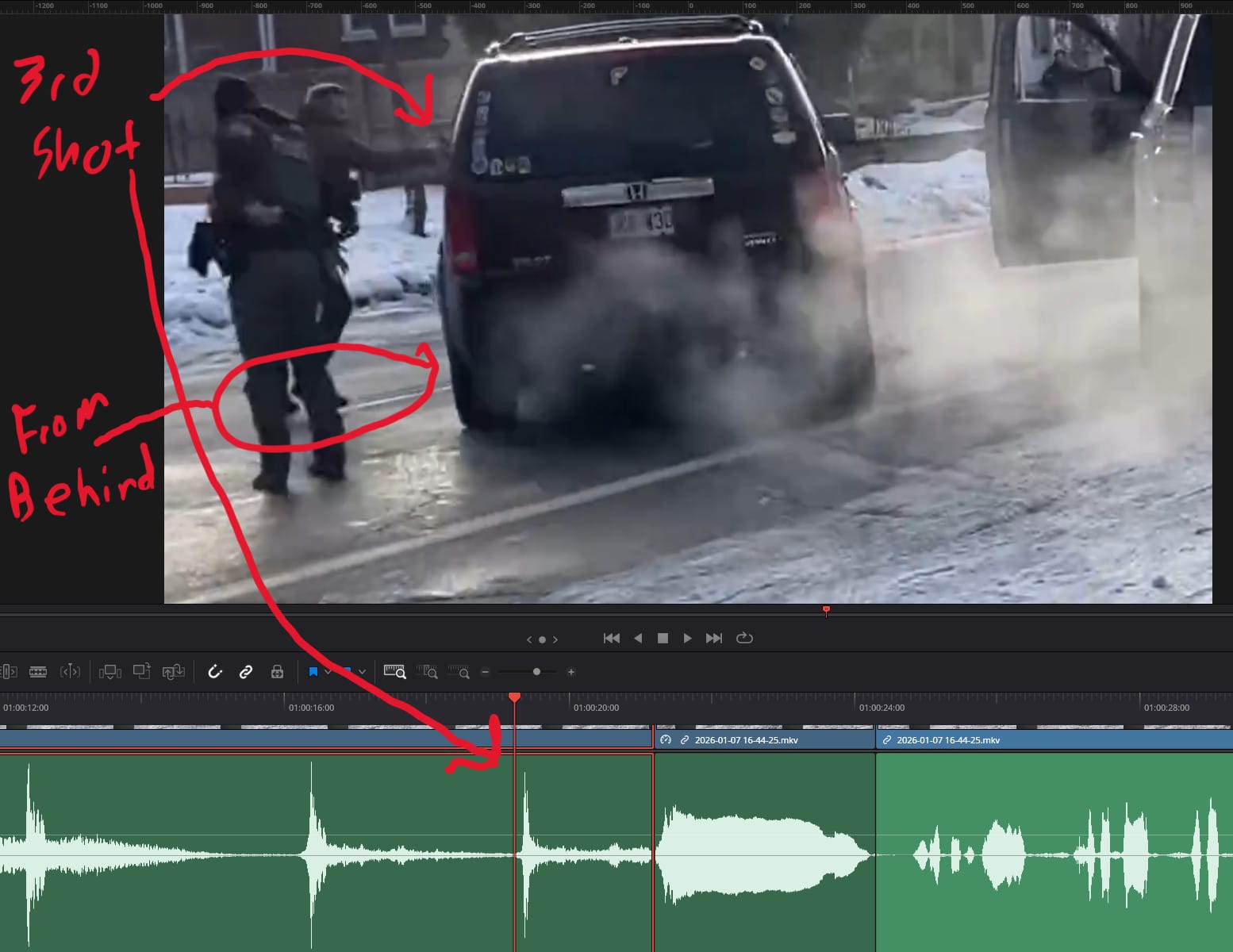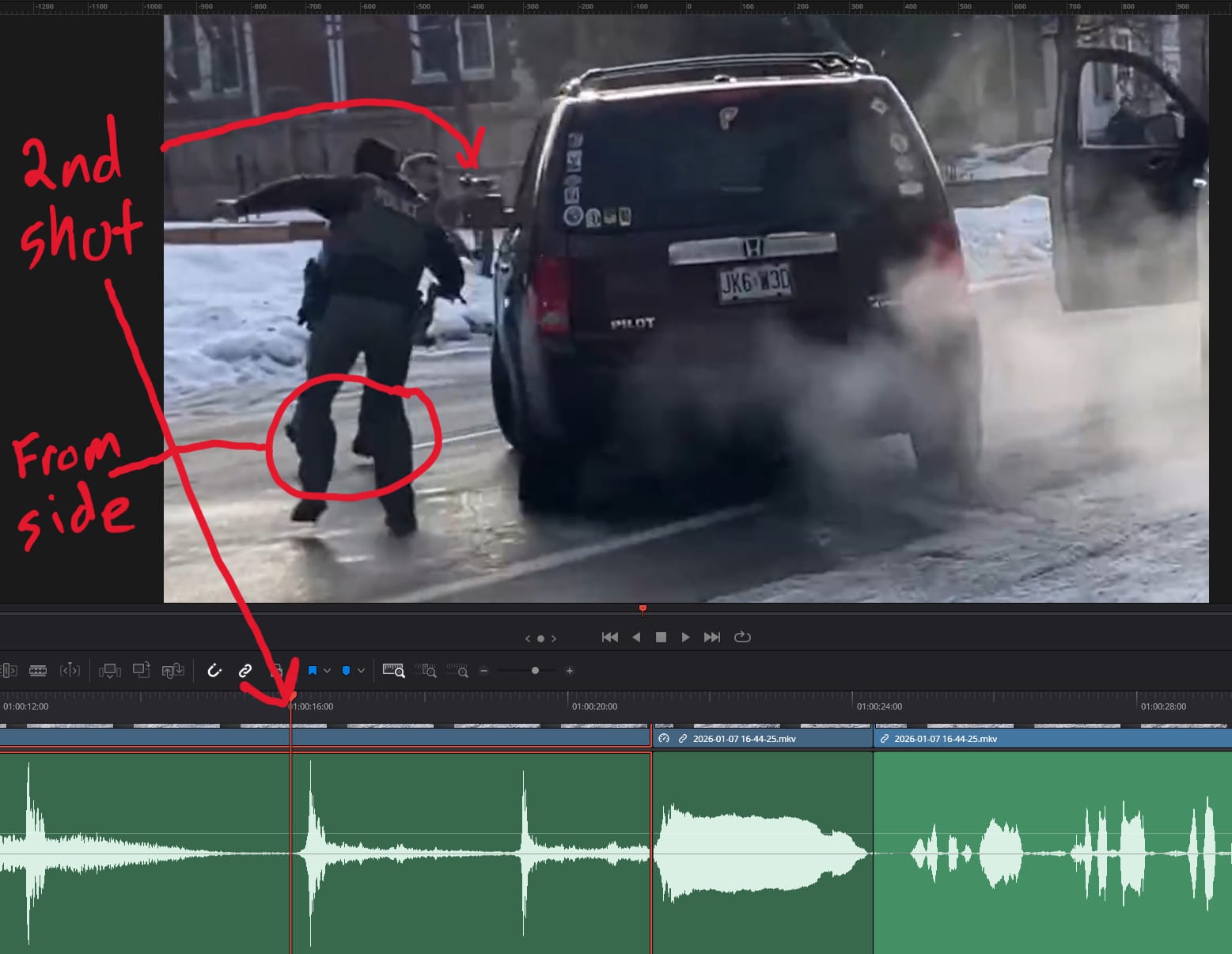 With a local copy of the video, I turned to DaVinci Resolve to allow me to trim the video to the moments surrounding the shooting, slow down the events, and compare the audio and video on a timeline to determine when each shot occurred and whether the ICE agent was indeed in the path of the vehicle when he began firing. NOTE: He was not.